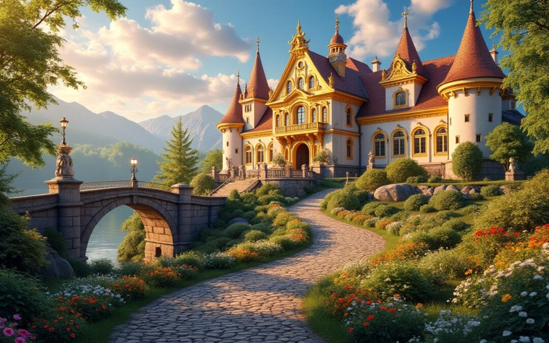 Dans l’illustration, l’architecture du château mise sur des tours élancées, des dorures partout, une symétrie presque parfaite. On sent une influence de château de conte de fées façon Disney, mais avec une lumière plus intense, presque irréelle.
