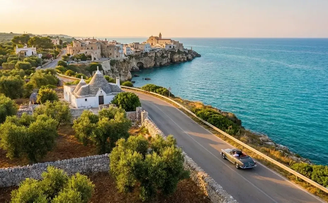 Quand tu arrives dans les Pouilles, tu sens vite que tout fonctionne à son propre rythme. La lumière accroche les façades blanches, les oliviers s’étirent à perte de vue, et la mer Adriatique déroule cette ligne bleue qui accompagne presque chaque déplacement.